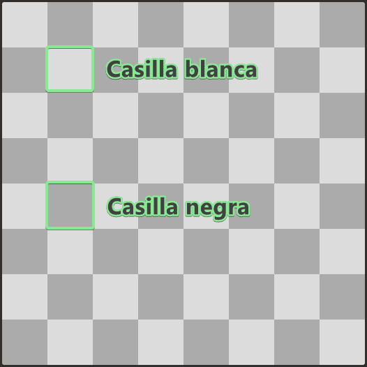 Cada recuadro del tablero, hay casillas blancas y negras.